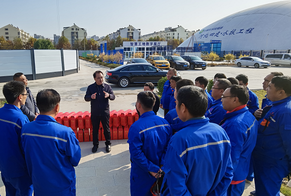 在加氯加药车间,他关切询问地基处理情况,了解水泥土桩养护及实验报告情况,要求项目部高质量完成施工策划,确保各工序间的无缝衔接,用实际行动高效完成进度目标。